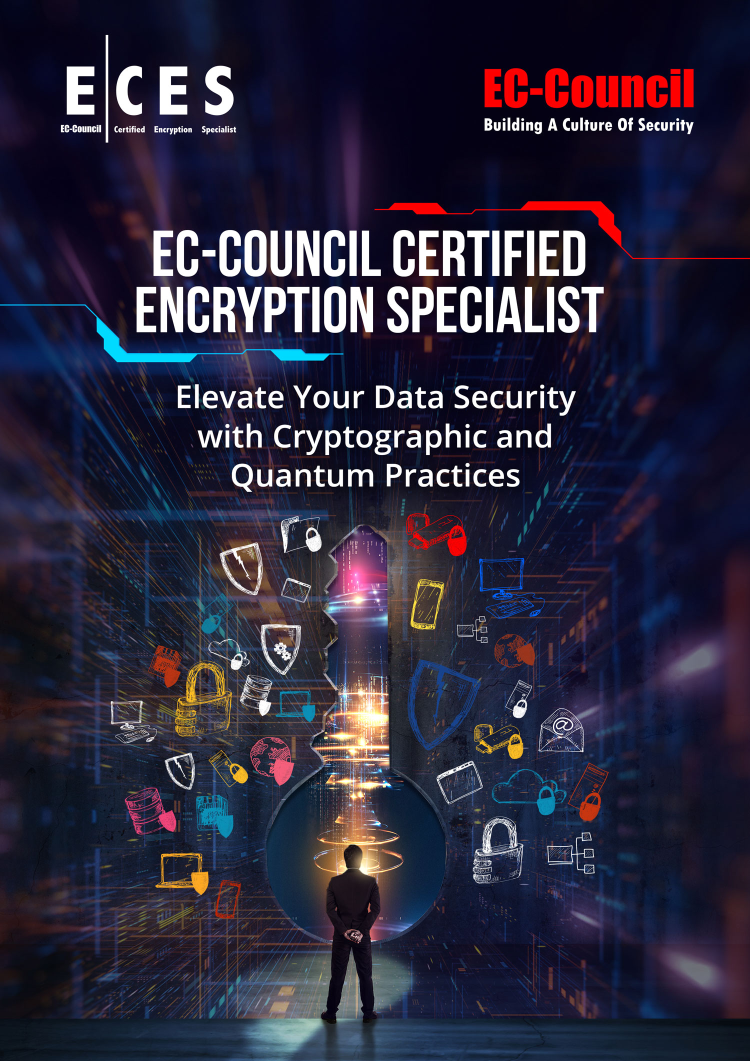 EC‐Council’s Certified Encryption Specialist (E|CES) program is designed to introduce professionals and students to the intricate field of cryptography. Covering a broad spectrum of topics, the E|CES program delves into modern symmetric key cryptography, offering detailed insights into Feistel Networks, Data Encryption Standard (DES), and Advanced Encryption Standard (AES) algorithms. Additionally, students gain familiarity with various other algorithms, including Blowfish, Twofish, Skipjack, CAST, TEA, and more. The curriculum extends to information theory basics as applied to cryptography, covering essential concepts such as hashing algorithms (MD5, MD6, SHA, GOST, RIPMD 256) and asymmetric cryptography with in-depth discussions on Rivest-Shamir-Adleman (RSA), Elgamal, Elliptic Curve, and Digital Signature Algorithm (DSA).